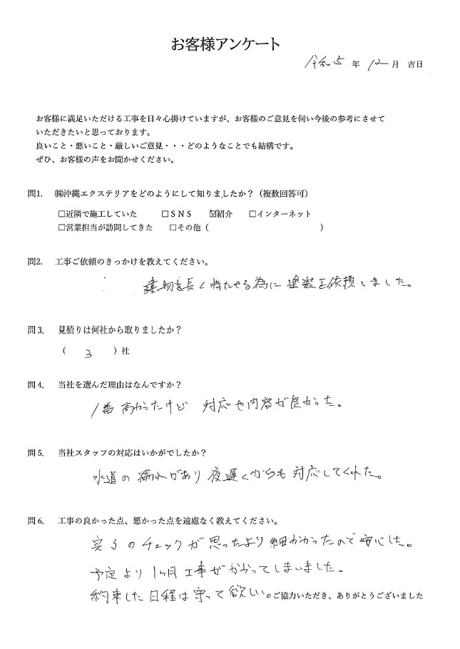 | 住所・お名前 | 宜野湾市 M様 |